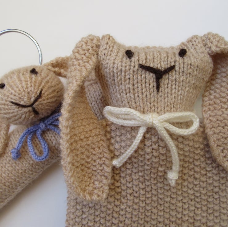 A hand knitted vanilla fudge coloured bunny hottie cover.