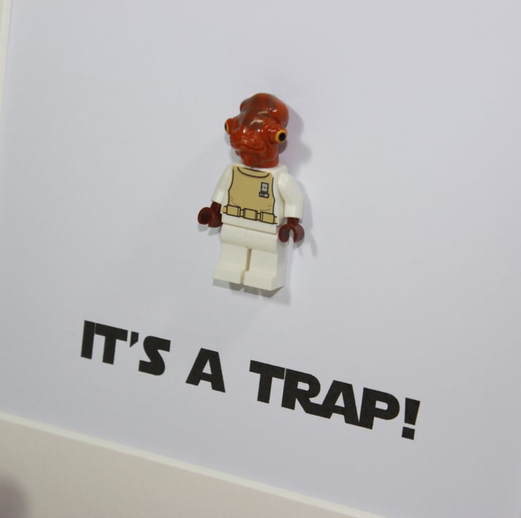 In a galaxy far, far away we were introduced to the legendary Star Wars. This sci-fi universe allowed us to meet countless different characters, many of which have been immortalised in mini Lego form. One such rebel didn't have much screen time in the original trilogy but he has grown to become a cult figure - we would like to introduce you to Admiral Ackbar. His quote "It's a trap!" stands out as one of the defining moments from the original Star Wars Trilogy. We have framed an original Lego minifigure of Ackbar along with this classic quote.