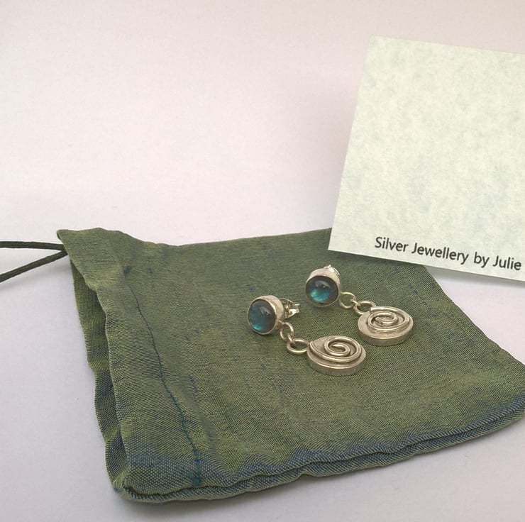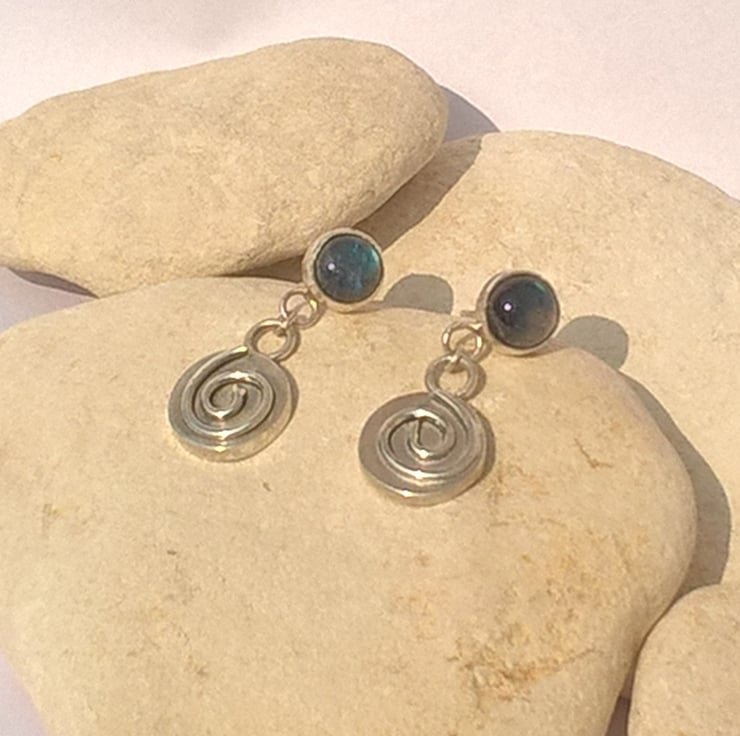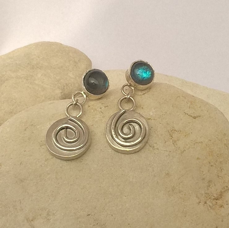 The stones are 8 mm labradorite cabochons. The drops are 12 mm chunky silver circles embellished with a silver spiral