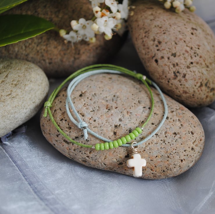 A set of two friendship bracelets 1) pale blue cord and a white howlite cross 2) waxed lime green cord with lime beads.