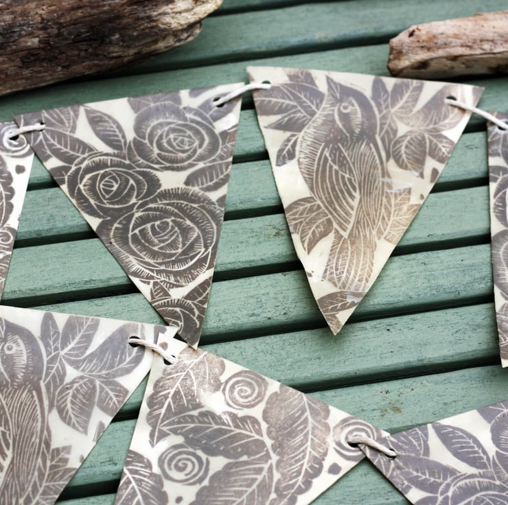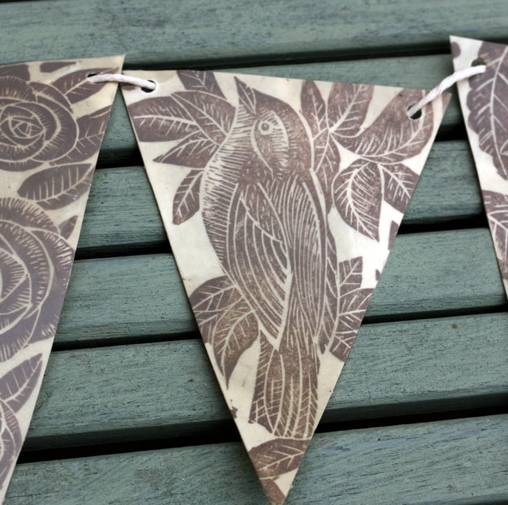 Each garland has been hand printed using individual carved lino blocks. Printed in sepia brown ink, then waxed to create a translucent effect when held to the light.