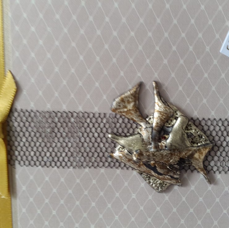 A completely handmade and uniquely designed card. Consisting of a gold/copper memorable plastic which has been modelled into a funky abstract modern design. Mounted onto black net, then onto beige trellis paper, then gold card then onto quality cream card. Finished off with a with love tag and gold satin ribbon and how