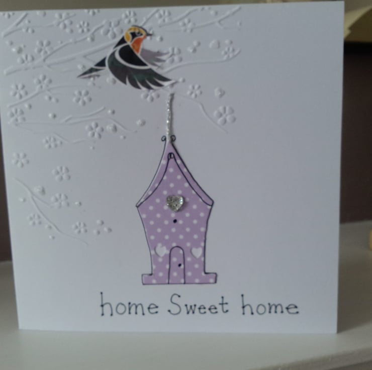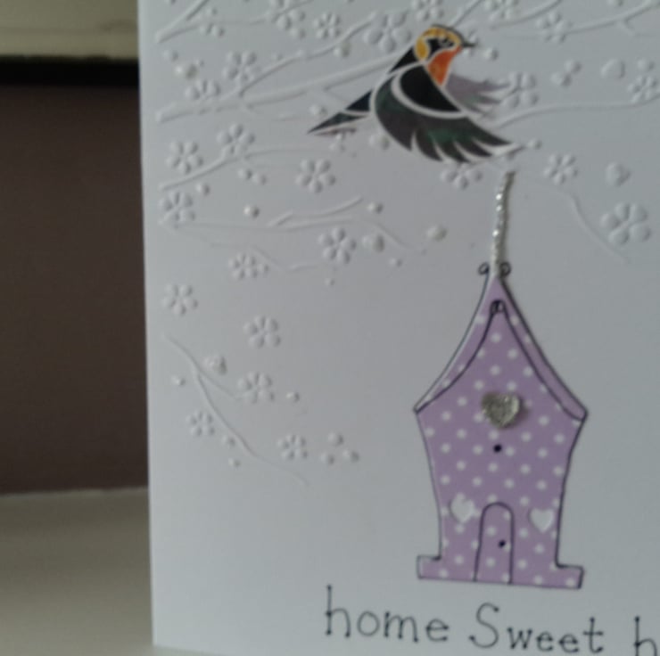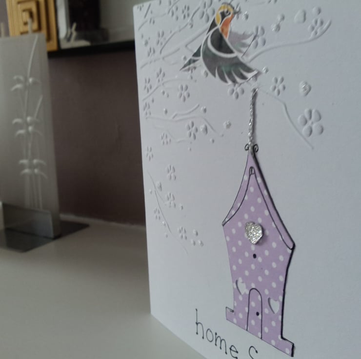 A completely handmade and uniquely designed card. Consisting of quality pristine white card which has a pretty branch embossed. Hanging from one of the branches is a handful bird house from lilac and white dotty card. Finished off with twinkly plastic heart, bird and home sweet home handwritten in black ink.