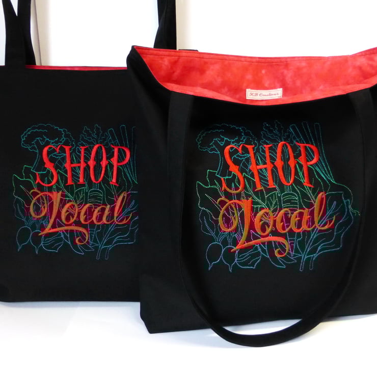2 x ‘Shop local’ embroidery in green with red lettering
