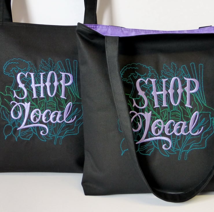 2 x ‘Shop local’ embroidery in green with lilac lettering