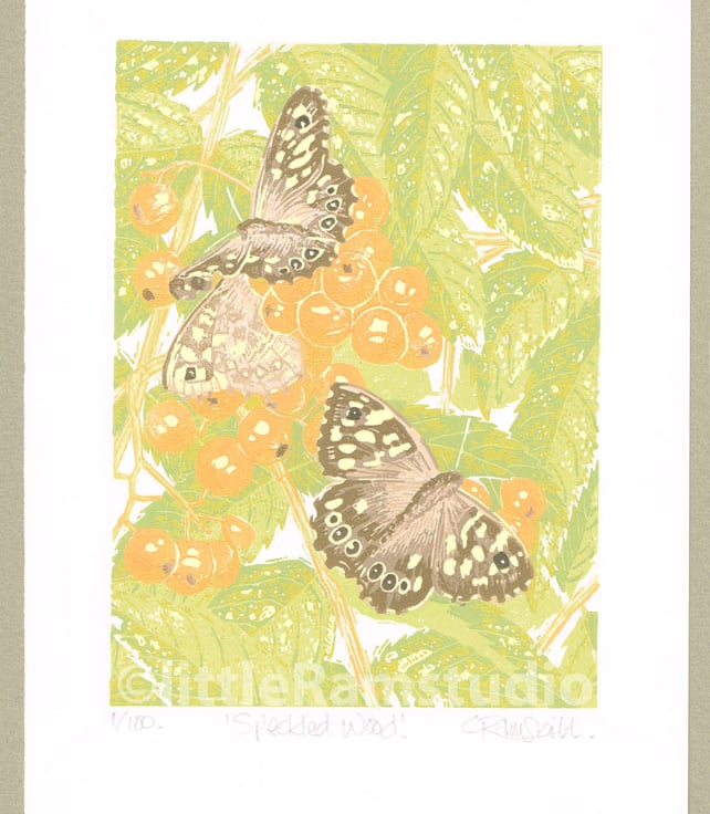 Butterfly limited edition linocut print, titled 'Speckled Wood'. Hand cut and printed on hand press. Signed, editioned and titled in pencil by the artist.
