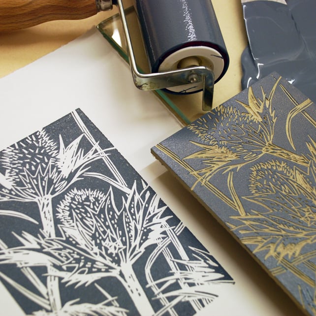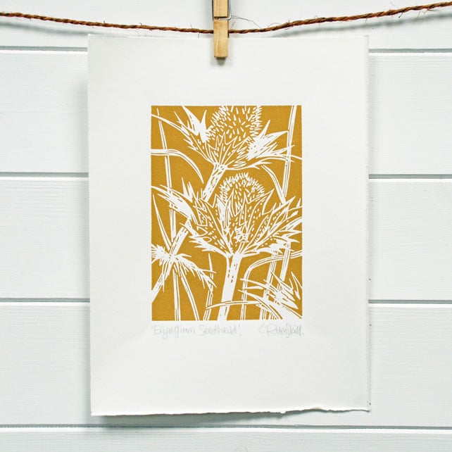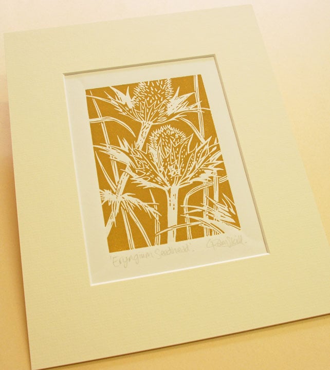 Seedhead titled Eryngium. Hand cut Linocut Print.