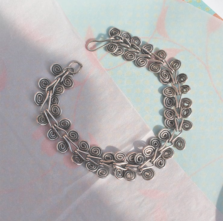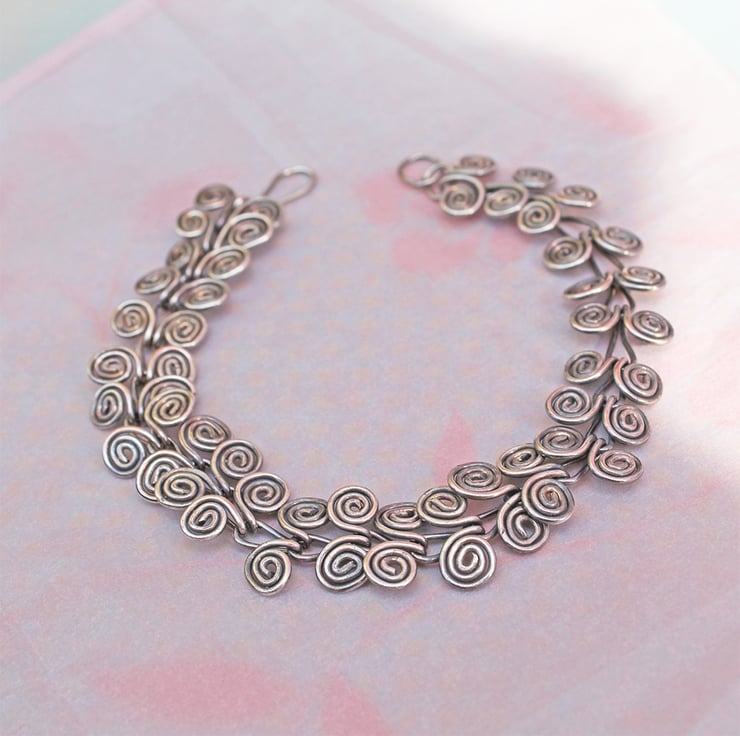 A delicate bracelet of silver-plated copper links, oxidised and polished to give an antique, silvery bronze look. Made from 26 links, these are individually made from wire, the ends coiled to give the butterfly wings effect.