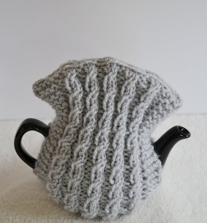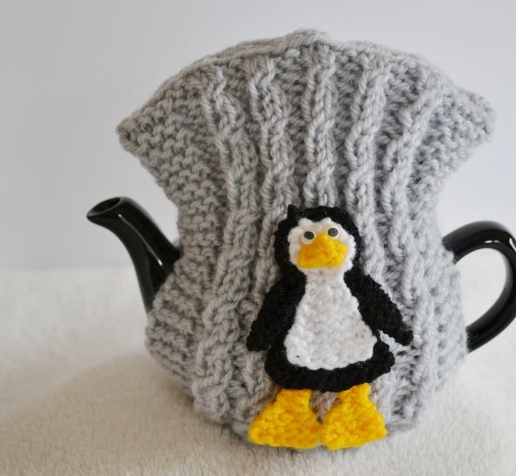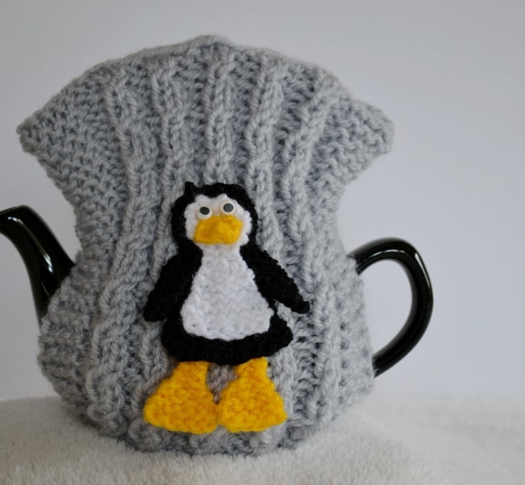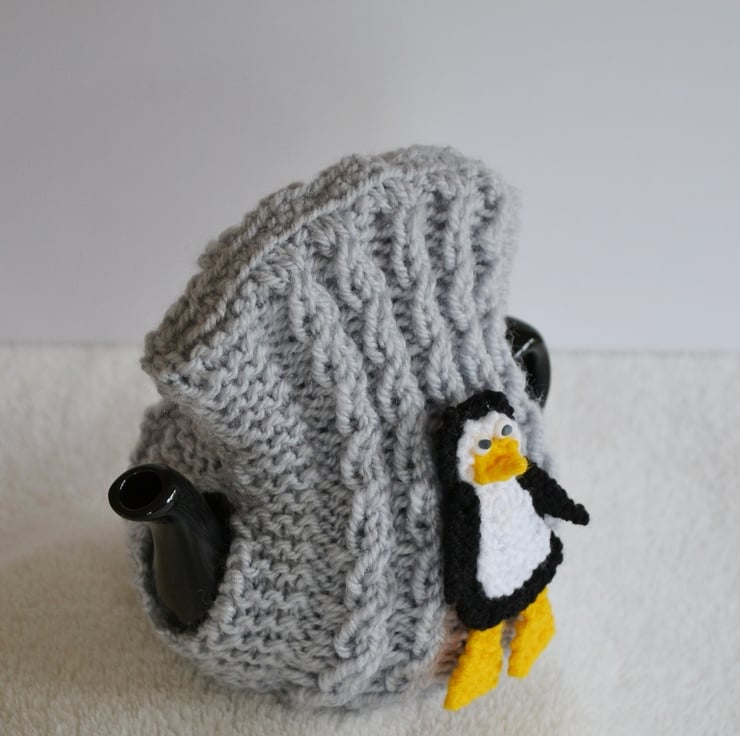 Knitted in aran in acrylic with 25% wool fibres. Fits 1-2 cup teapots. Knitted in a mock cable pattern. Finihed with a hand knitted penquin applique which I have sewn to the teapot.