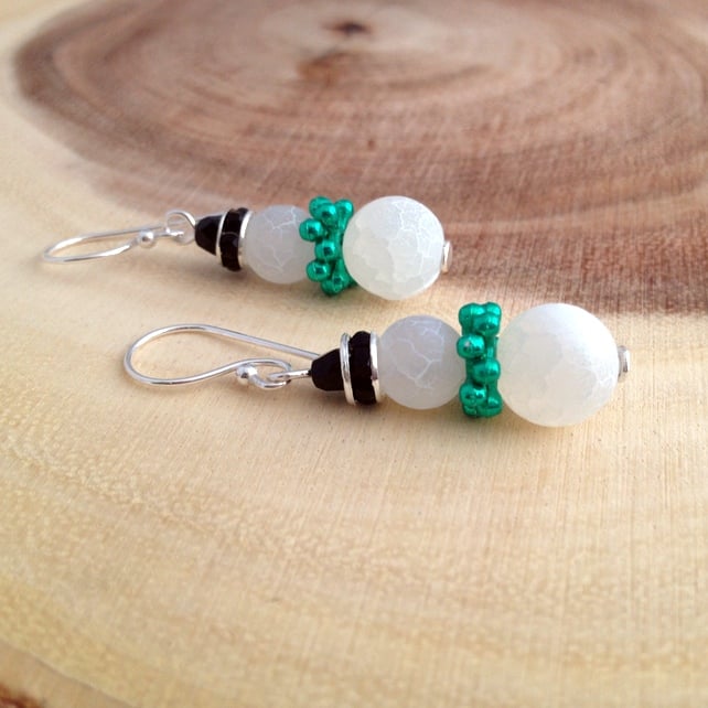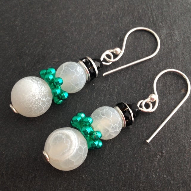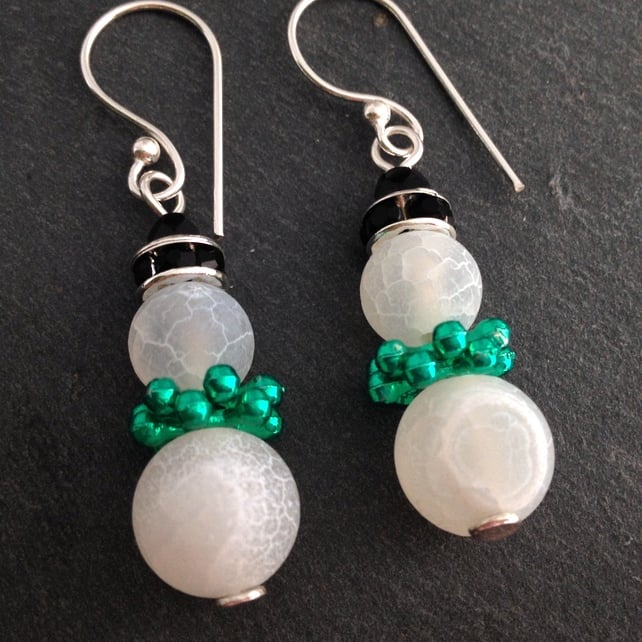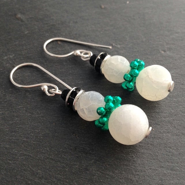 Each snowman has been made using frosted White Agate beads that look like perfect little snowballs. To keep his neck warm he wears a green snowflake bead scarf, and his outfit is finished off with a hat made of a black rhinestone bead and fire polish crystal.