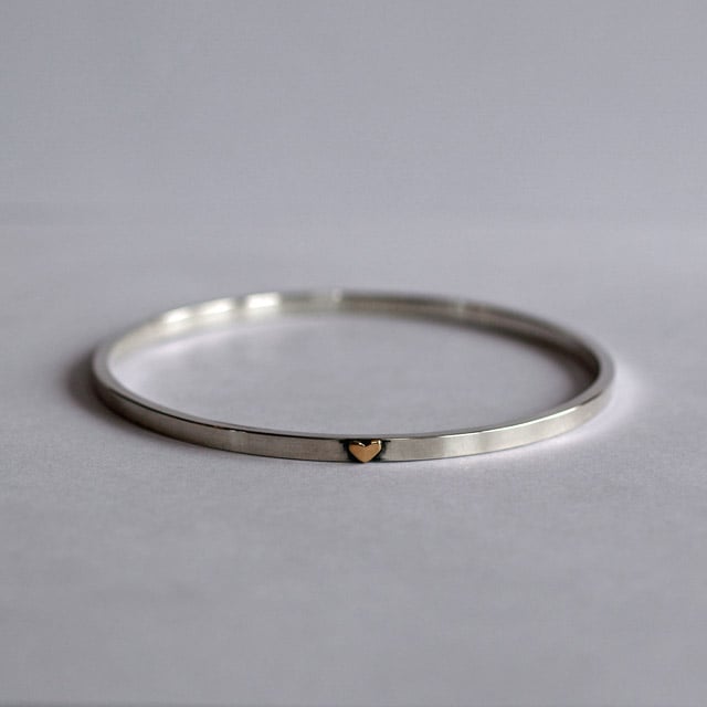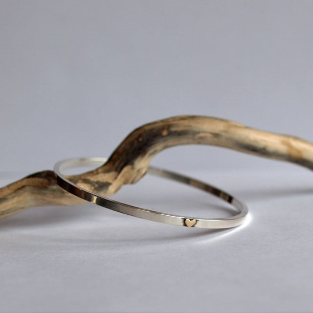 This bangle has been handmade in solid recycled sterling silver and has a hand cut recycled 9ct yellow gold heart soldered onto it. Around the heart has been oxidized to emphasise the contrasting colours of gold and silver.