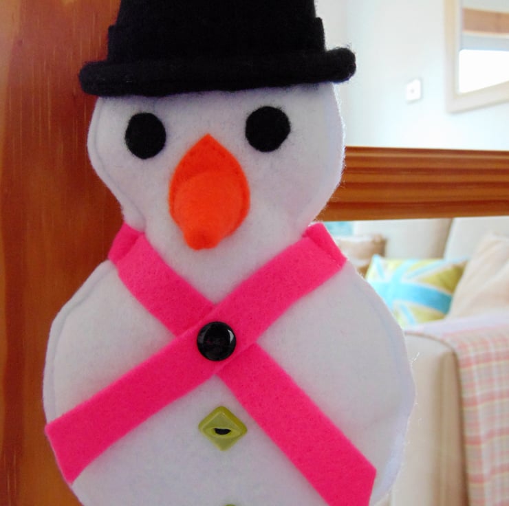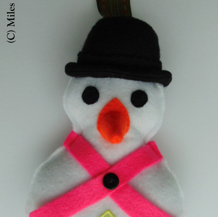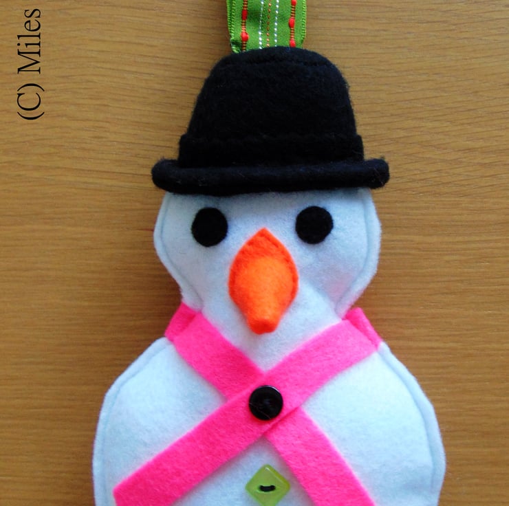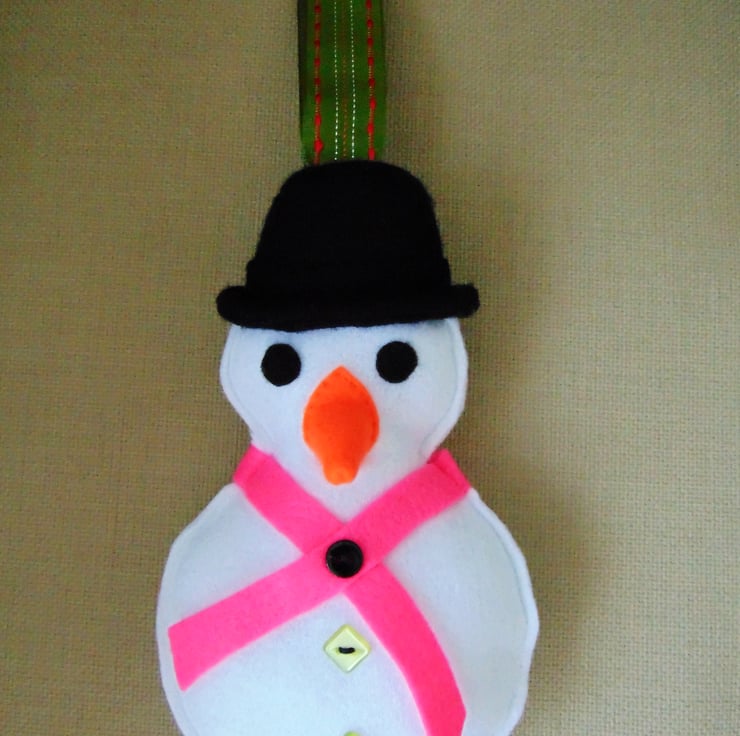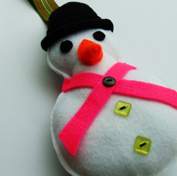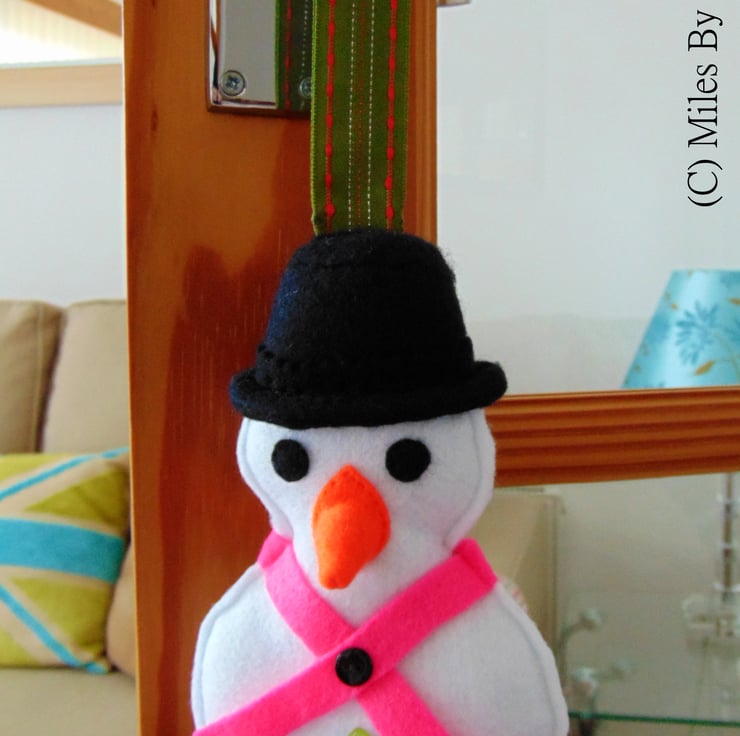 This cute hanging snowman with his black bowler hat and pink scarf is a bright and modern style Xmas decoration.