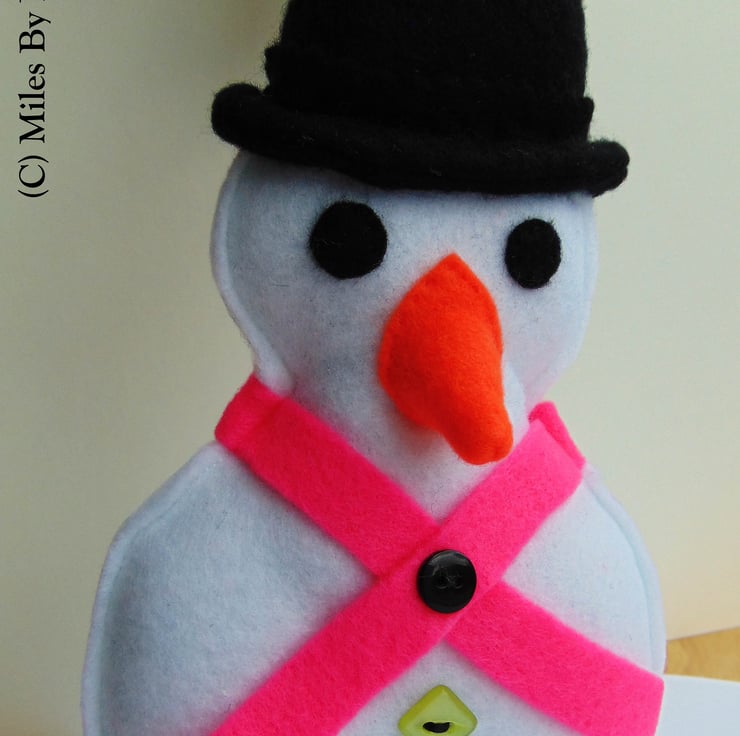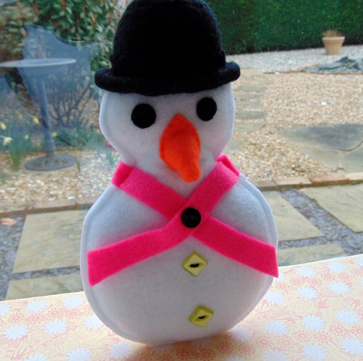 He is hand cut from white felt and carefully hand-stitched together and filled with a soft hollow fibre filling. He has a bright pink felt scarf with a black button and two green buttons sewn onto his front.