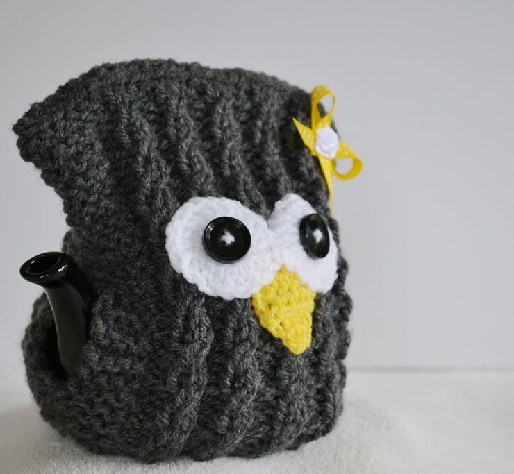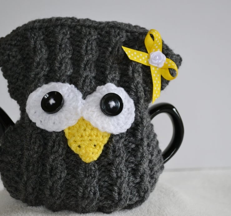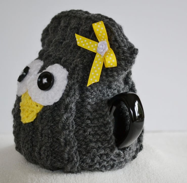 I have crocheted the facial features and added buttons in the centre of the eyes. Finished with a yellow polka dot grosgrain ribbon bow with a small white satin rose in the centre.