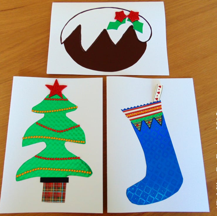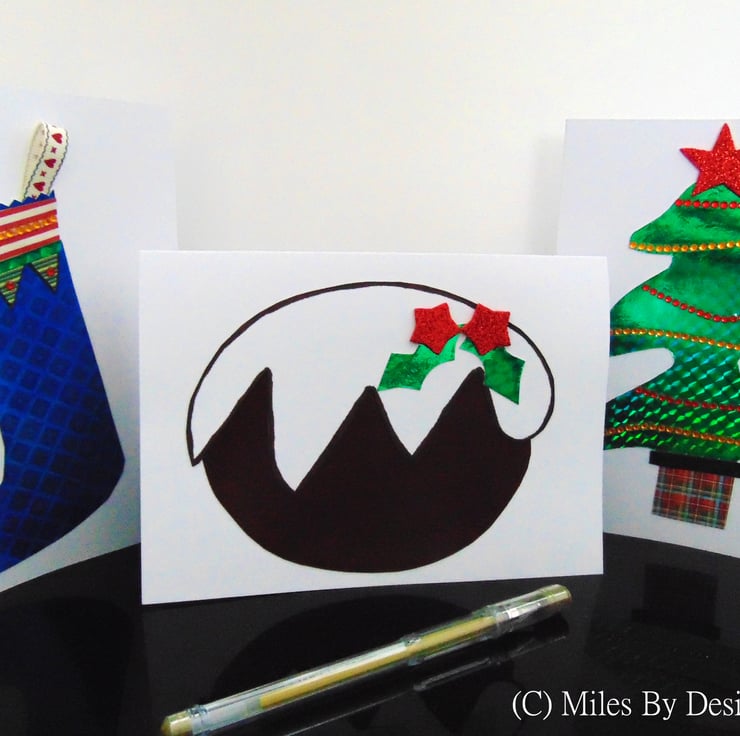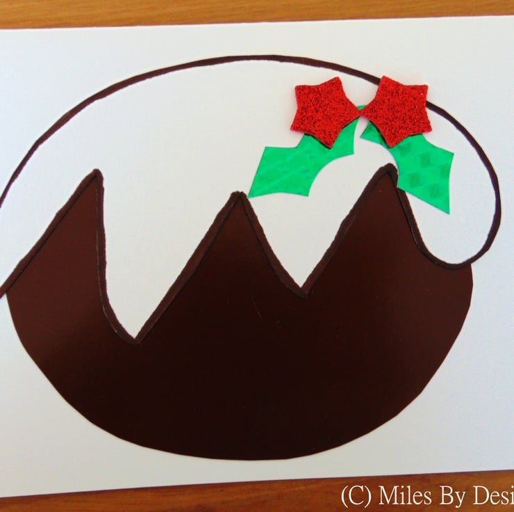 Card 2 is a Xmas pudding, it is hand-cut from brown card with white card icing and topped with holographic green holly leaves and red glitter foam stars for berries.