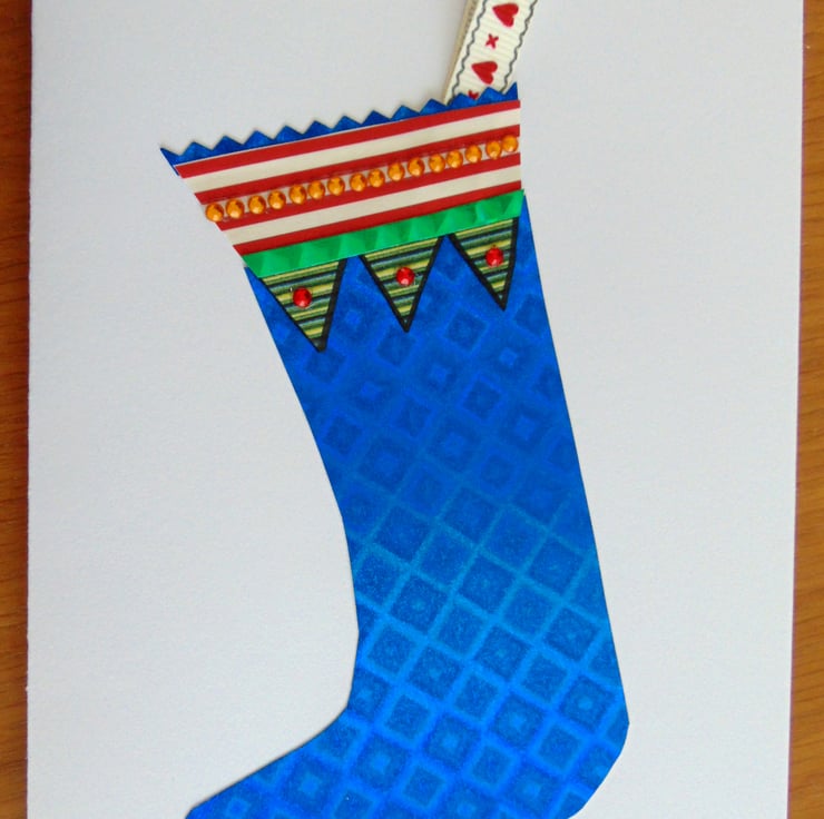 Card 3 is a Xmas stocking, hand-cut from blue holographic card with striped patterned card detail and red and orange plastic beads. It also has a cream coloured ribbon with hearts looped into the top.