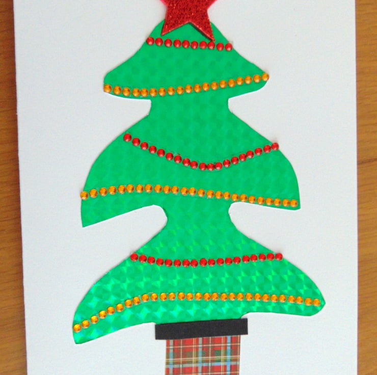 Card 1 is a Xmas tree, hand-cut from green holographic card. It has a tartan card stand. The orange and red decorations are plastic beads and it has a red glitter foam star to top it off.