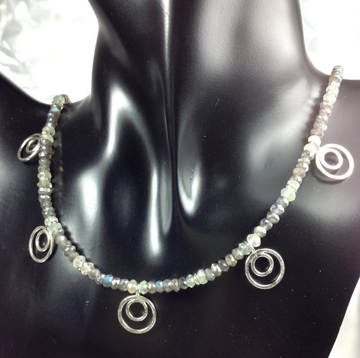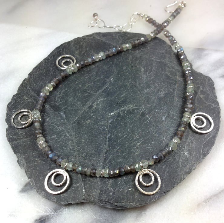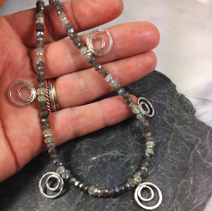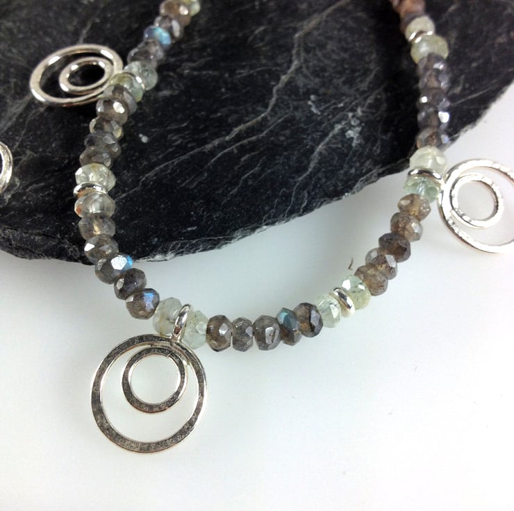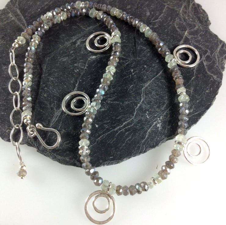 Faceted labradorite and aquamarine gemstones have been interspersed with silver spacers and teamed with five of my sterling peacock pendant beads.