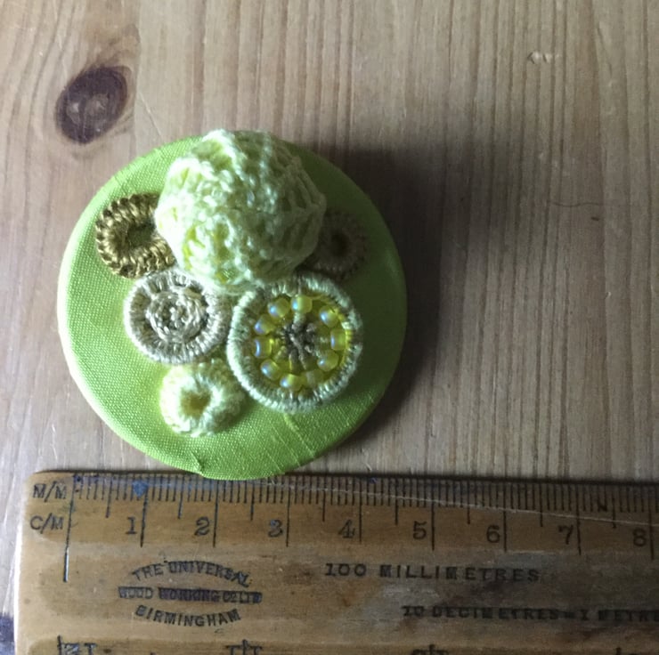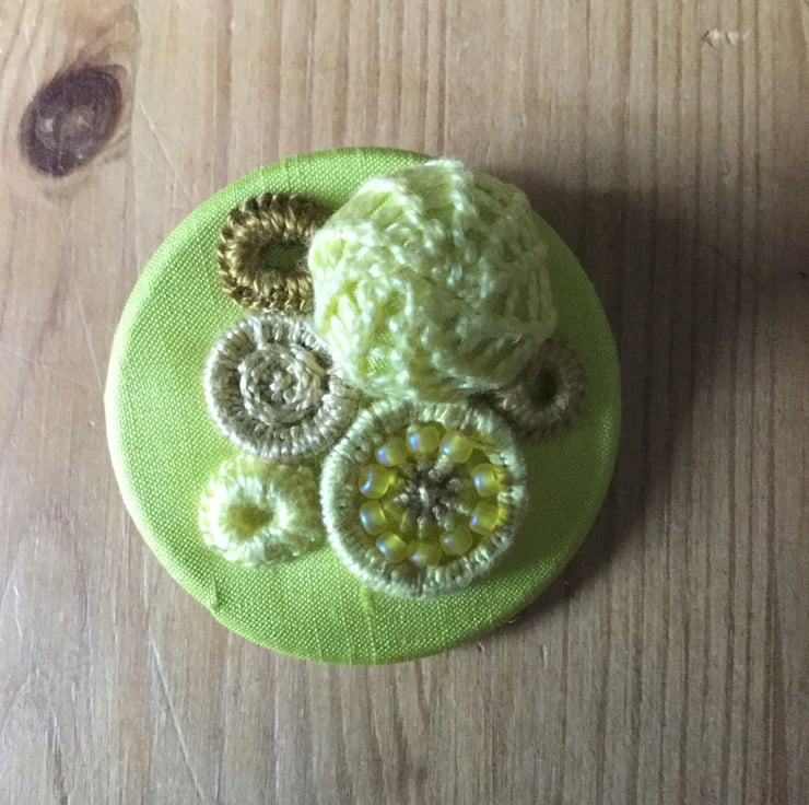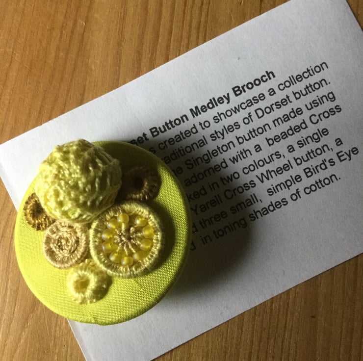 The base is a large (45mm diameter) Singleton button made using pure silk in a lemon yellow shade, which is adorned with a 18mm beaded Cross Wheel button worked in shades of yellow and light brown with tiny glass beads, a light brown coloured 15mm Yarell Cross Wheel button, a 15mm Dorset Knob in yellow and three small (10mm) simple Bird's Eye buttons in toning shades of yellow, light brown and tan cotton.