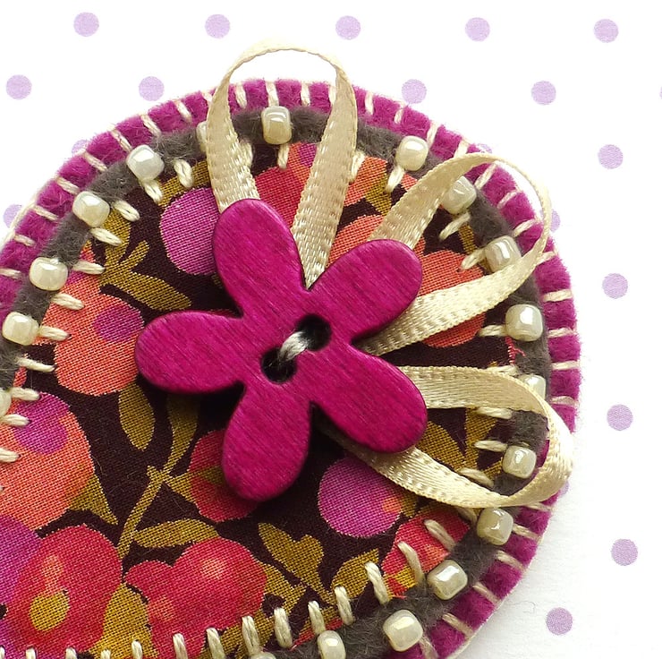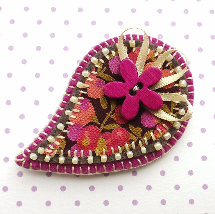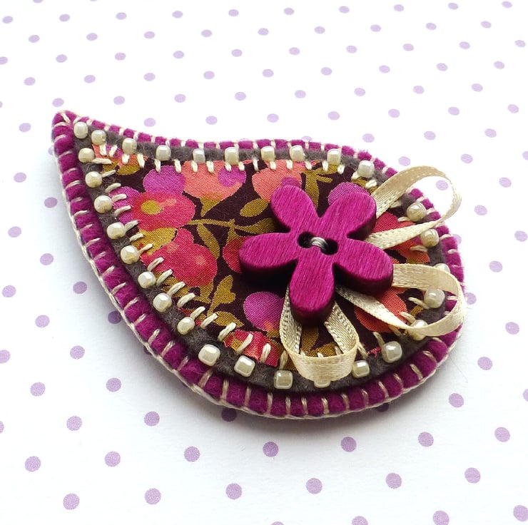 The Paisley brooch is in Liberty of London fabric in shades of brown, pink and purple. It has been appliqued onto dark grey felt which has been edged with cream beads. It has been further mounted onto mulberry pink felt and is finished with a feature wooden flower button with ribbon detail. There is a metal brooch pin on the reverse side for easy attachment.