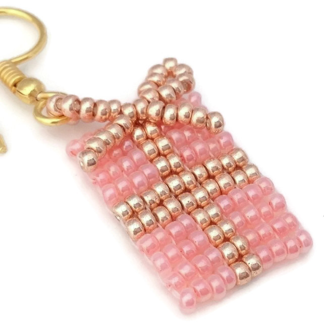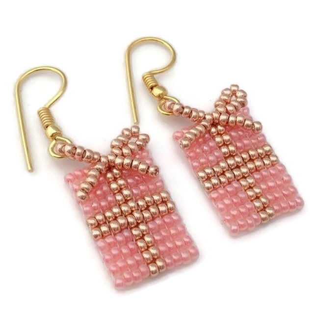 Made by hand sewing size 11/0 Miyuki seed beads in coral pink and blush gold to form a Christmas present shape. I have then created a bow out of the blush gold seed beads that finishes off the top of the present. The blush gold seed beads are slightly pinker than normal gold seed beads, they are almost rose gold in colour.