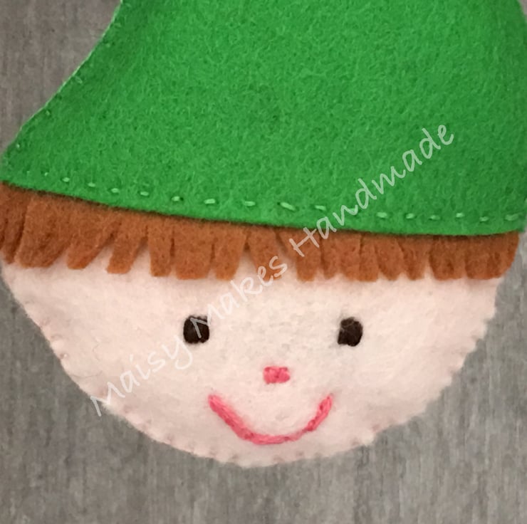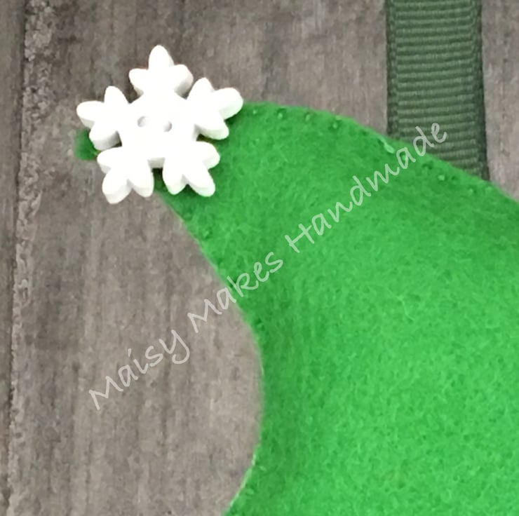 This Jolly Christmas Elf has been handmade, from my original hand drawn design and is made from 100% wool felt and has a grosgrain ribbon loop attached for ease of hanging. This item has been entirely cut by hand and all stitching and embroidery is also completed by hand. The Elf's hat has been embellished with a wooden snowflake button.