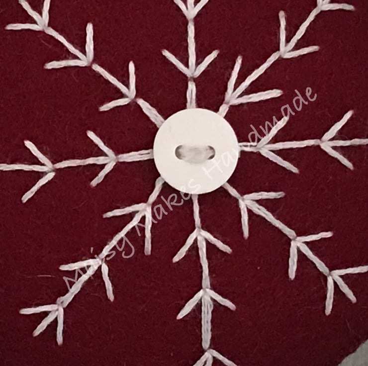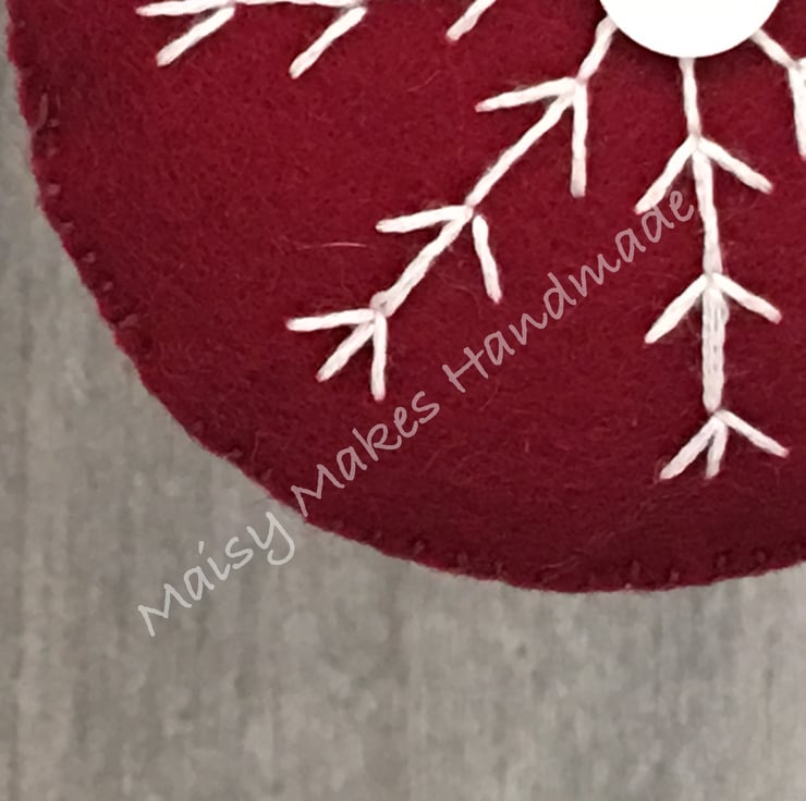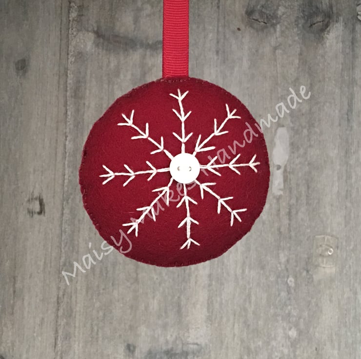 This Christmas Snowflake has been handmade, from my original hand drawn design and is made from 100% wool felt and has a grosgrain ribbon loop attached for ease of hanging. This item has been entirely cut by hand and all stitching and embroidery is also completed by hand.