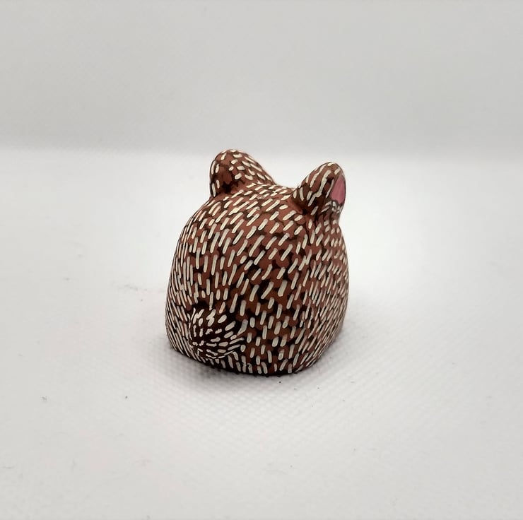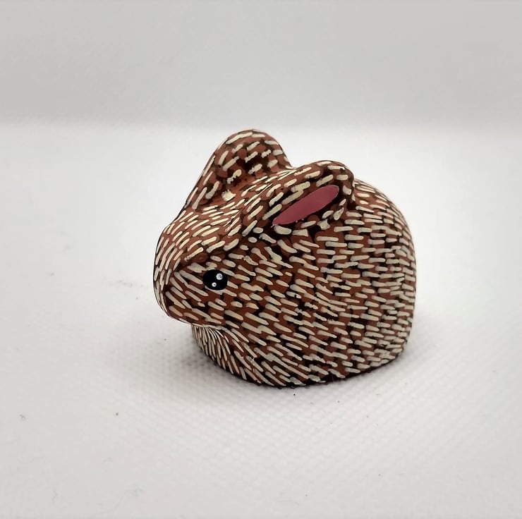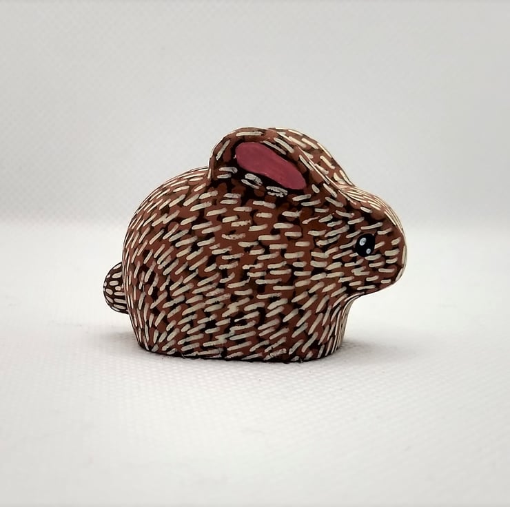 This rabbit miniature has been hand sculpted and cast by hand from my original clay figure. Painted with artists acrylics and finished with artists paint markers. This figure has also been given at least 2 coats of matte varnish to protect its finish.