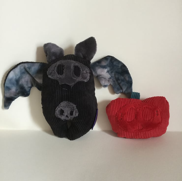 Handmade plushie Bat with wings and Skull logo on tummy. Great cuddly toy for children to play with and celebrate Halloween or any other time of year. Can also be used for decoration.