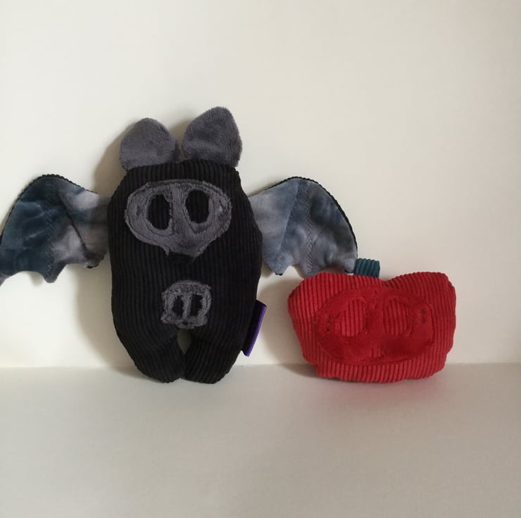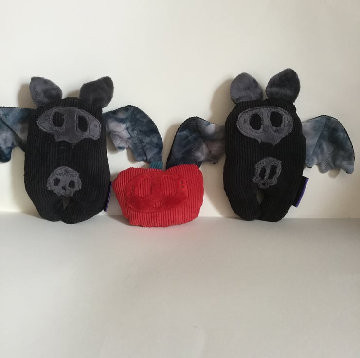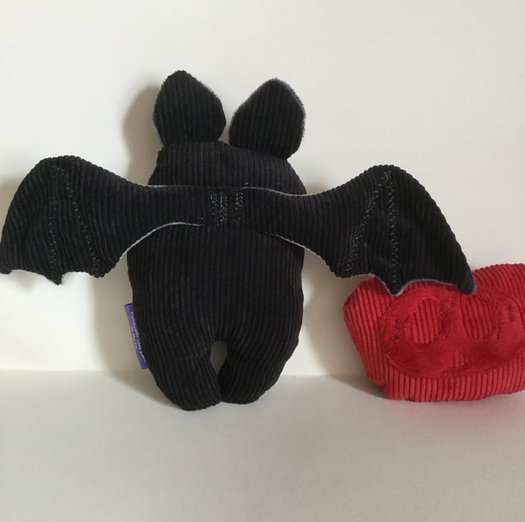 Handmade plushie Bat with wings and Skull logo on tummy. Great cuddly toy for children to play with and celebrate Halloween or any other time of year. Can also be used for decoration.