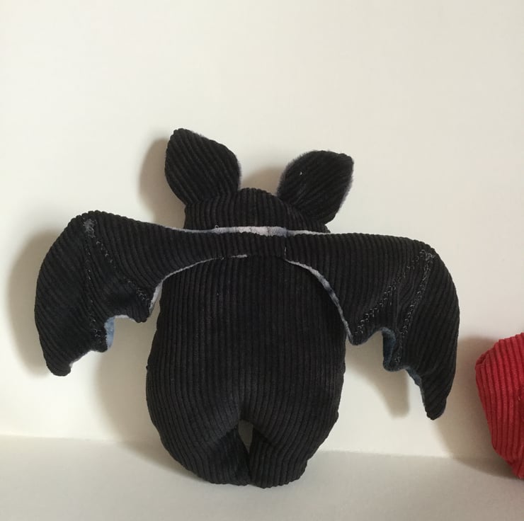Soft black corduroy with grey plush face and black plush nose. Grey plush and black corduroy backed ears and grey plush skull stitched on tummy. Tie dye grey plush and black corduroy wings with stitching.
