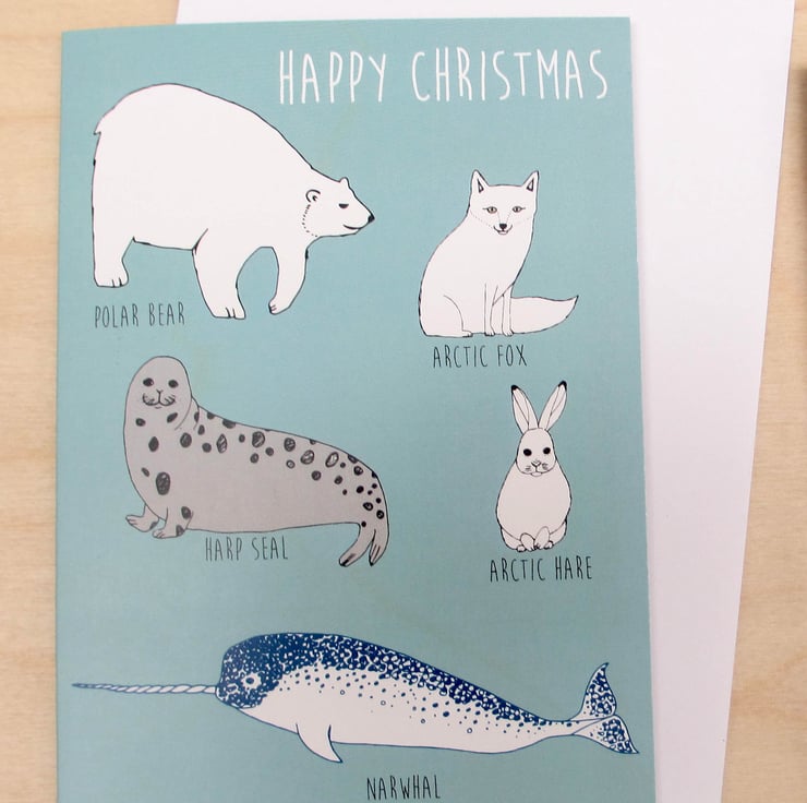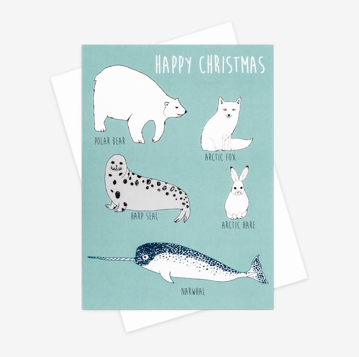 Originally drawn by hand, this illustration Features a Polar bear, arctic fox, arctic hare, Narwhal and harp seal.