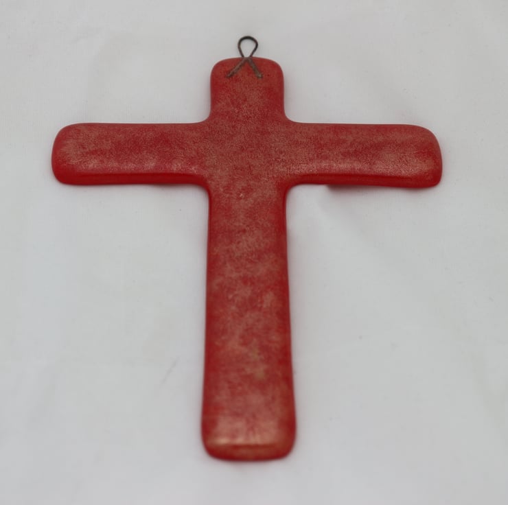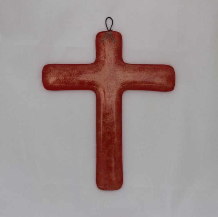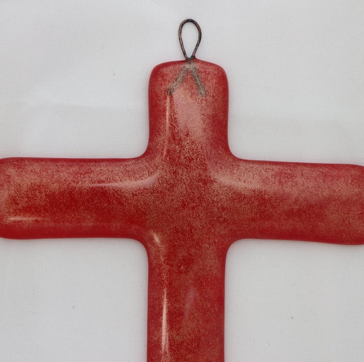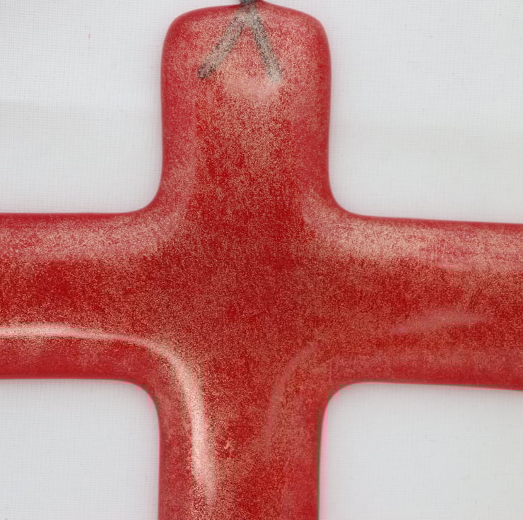 It is a lovely glass cross, with opaque red glass accented with a dusting of copper mica. An attractive and striking piece of glass.