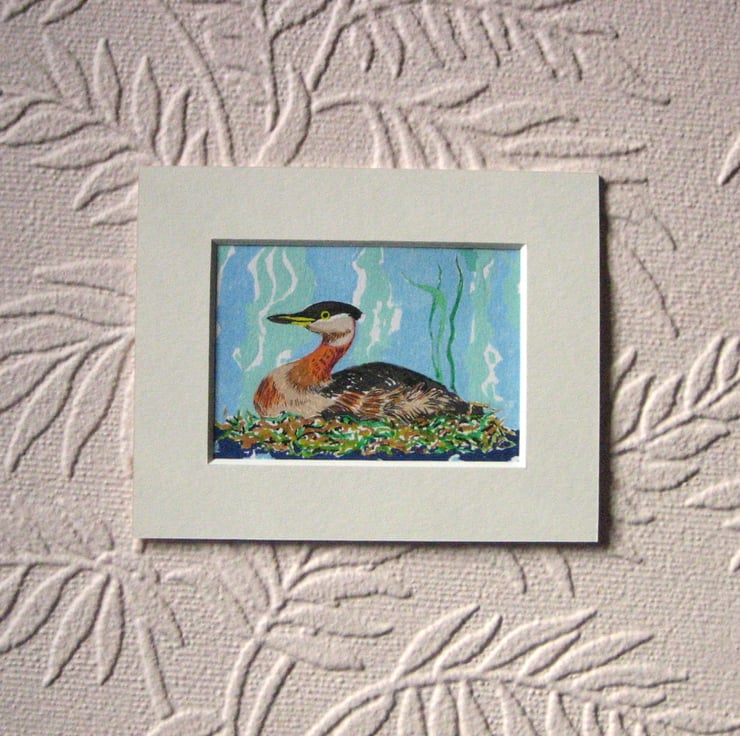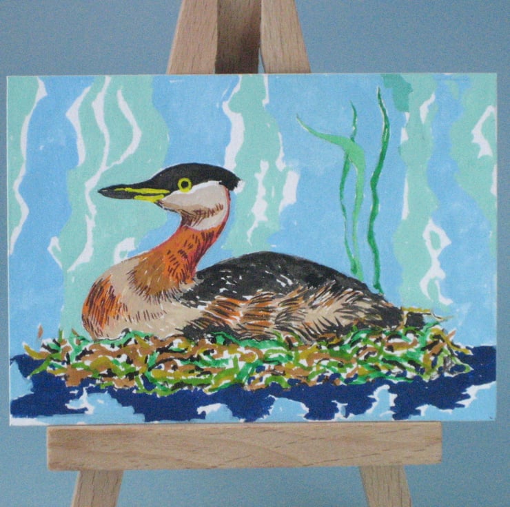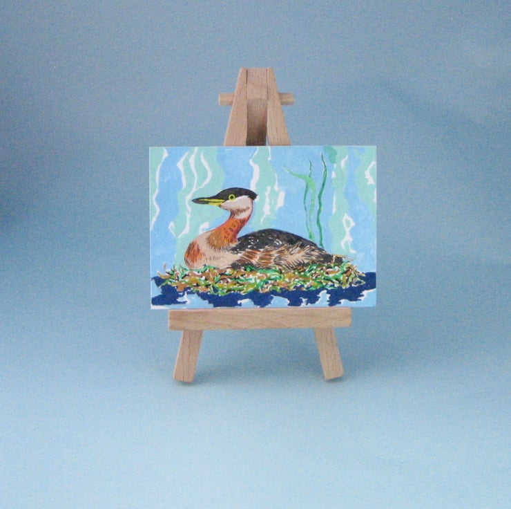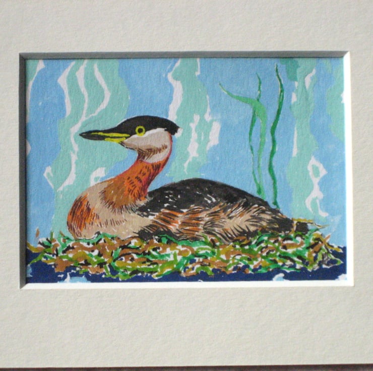 Was £10, now £6. Collectable painting of a grebe in gouache and ink. This red-necked grebe on its nest has been painted on textured watercolour paper and measure 2.5 x 3.5. It will be sent in a protective cellophane sleeve.