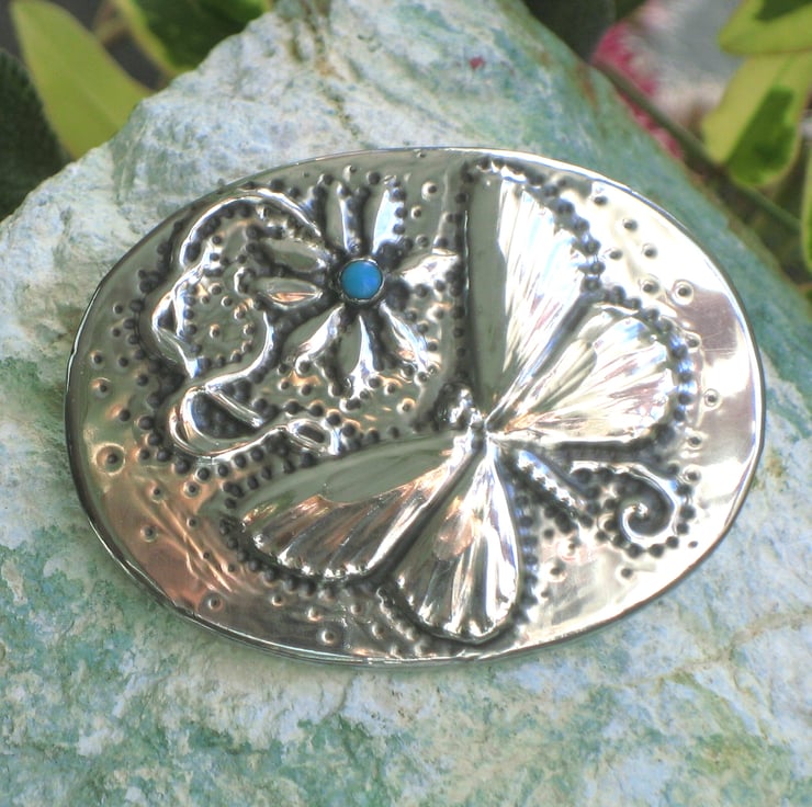 This pretty arts and Crafts style brooch has a design featuring a silvery butterfly and daisy, enhanced with a touch of turquoise.