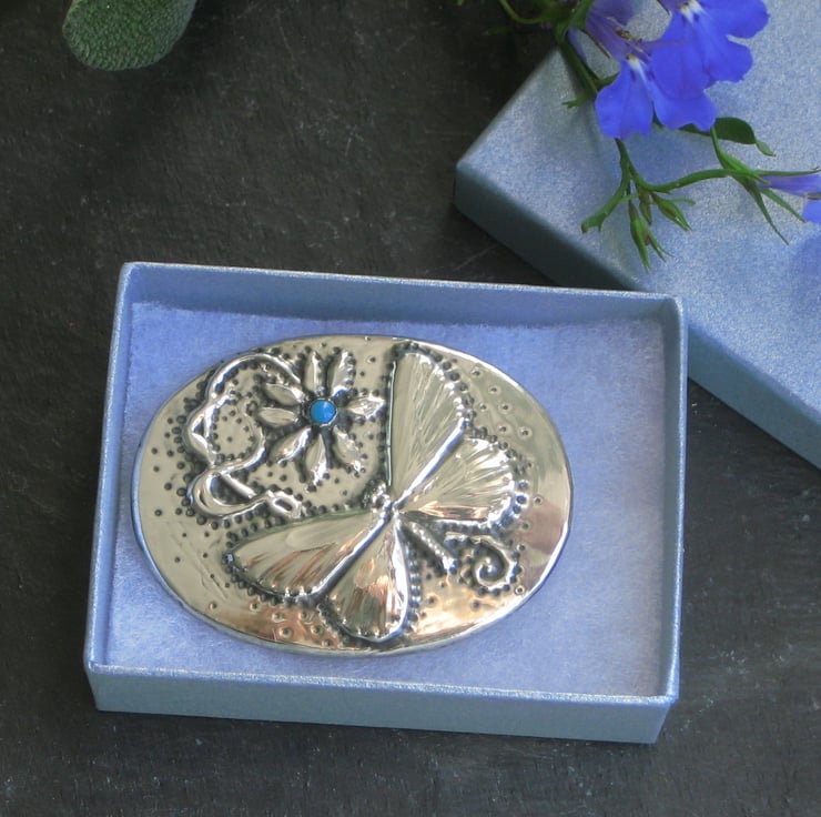 This butterfly brooch has been made using the repousse method of embossing a pattern onto sheet pewter using a variety of hand tools. The metal is then filled and mounted on a rigid base, in this case an aluminium blank.