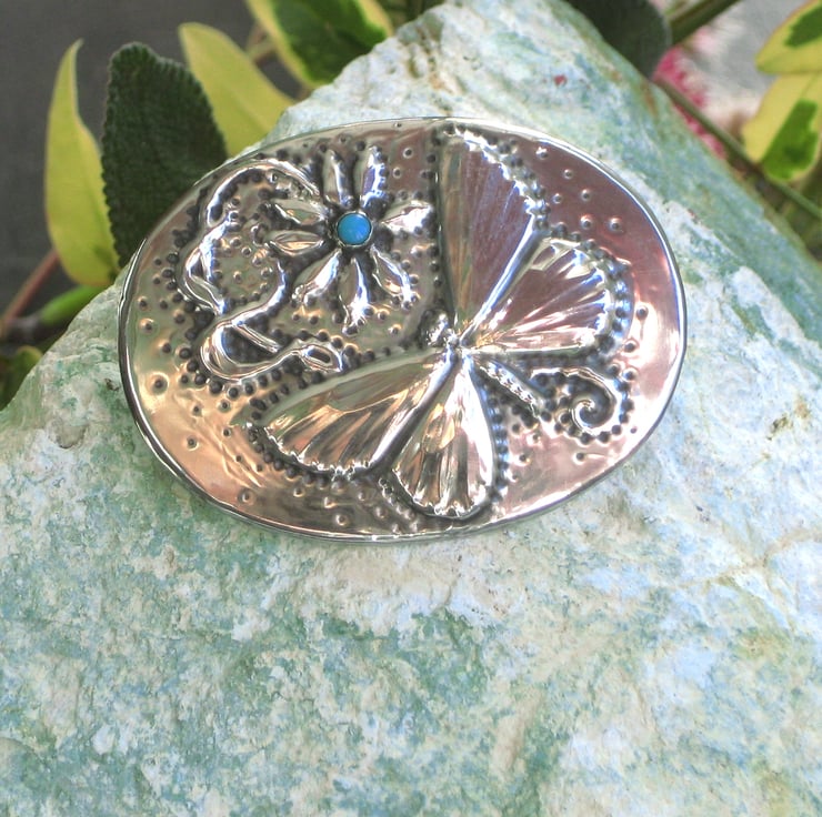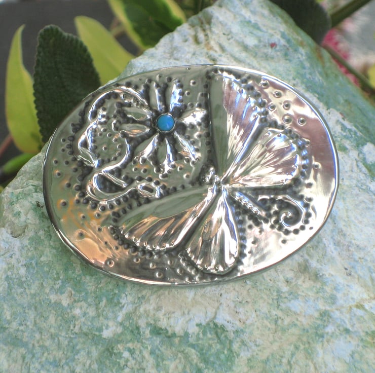 Handmade pewter butterfly brooch set with a little turquoise cabochon.