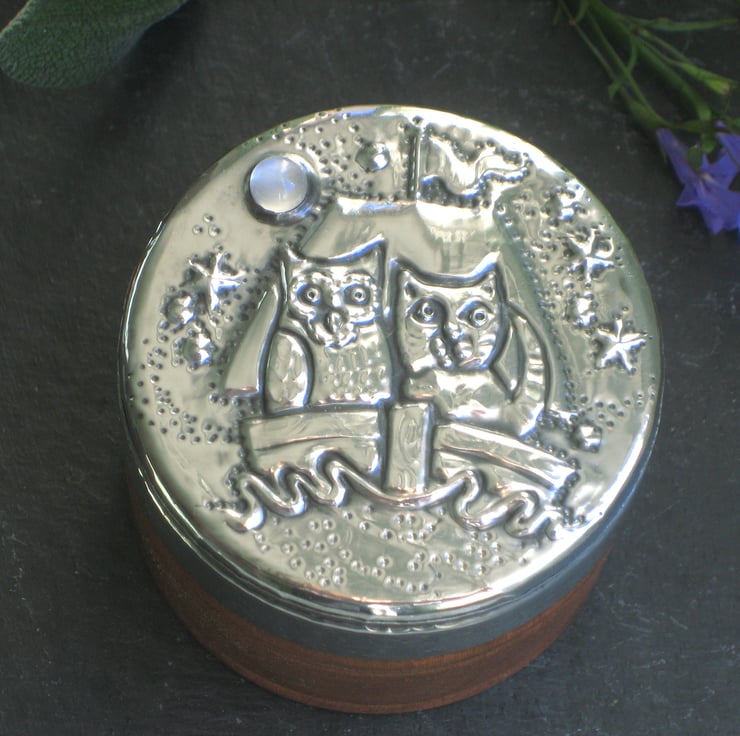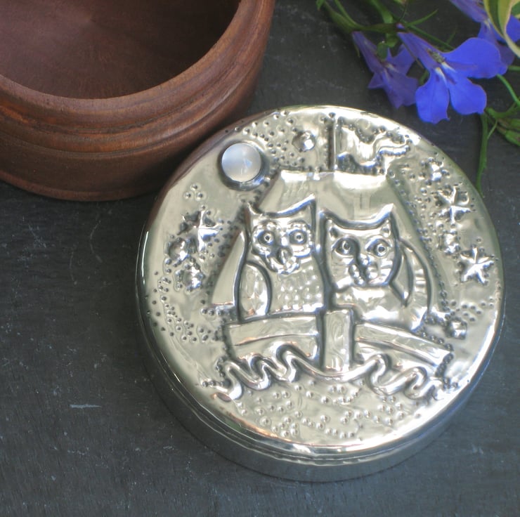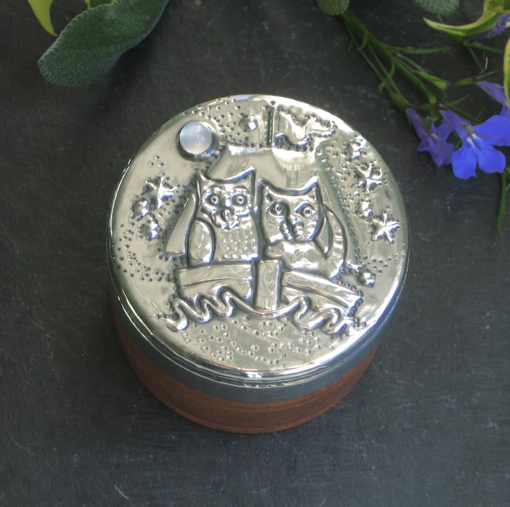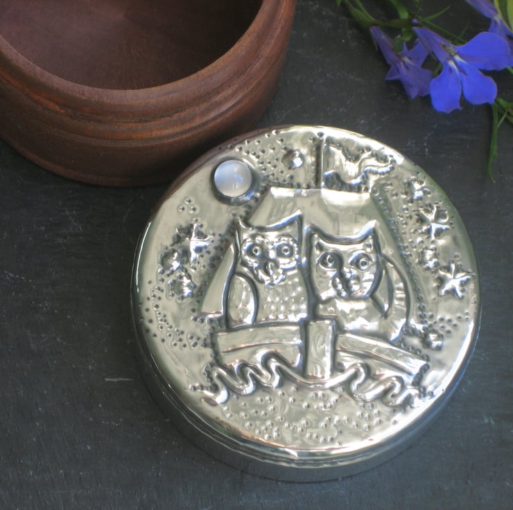 The Owl and the Pussycat handmade pewter box with moonstone.