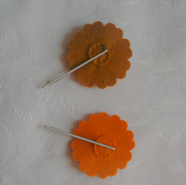 Two felt flower hair clips, all hand stitched, no glue.