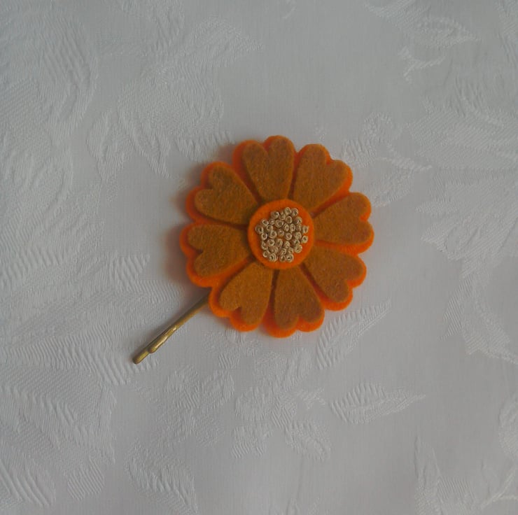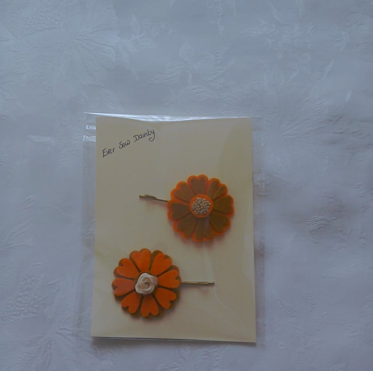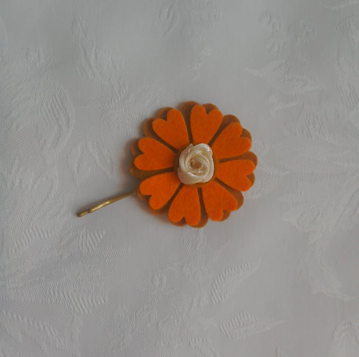 Made using cream, orange and brown felt in the colours of autumn. Stitched to a gold coloured hair pin which measures 2.5" (7cm) long