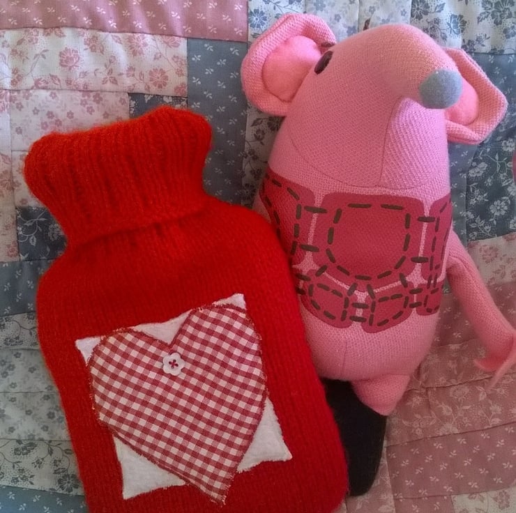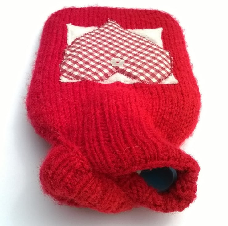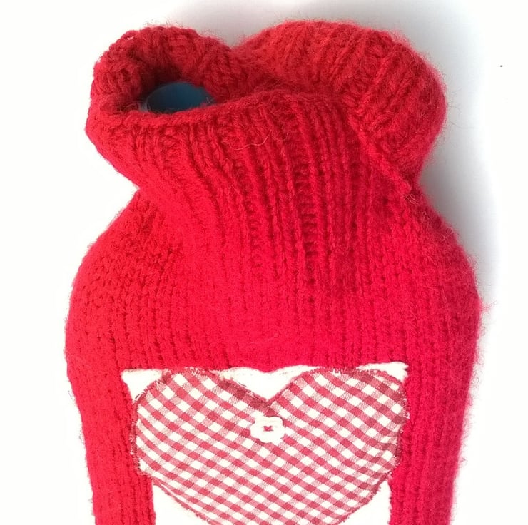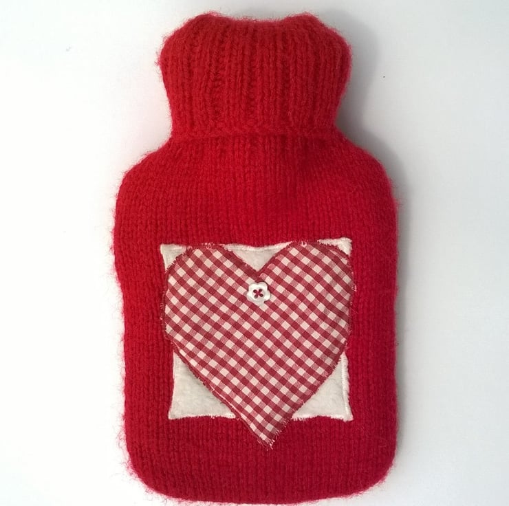 A pillarbox red hand knitted hot water bottle cover with a red and white gingham heart appliqued over a white fleecy square on the front, all finished off with a white flower button sewn securely on the heart.