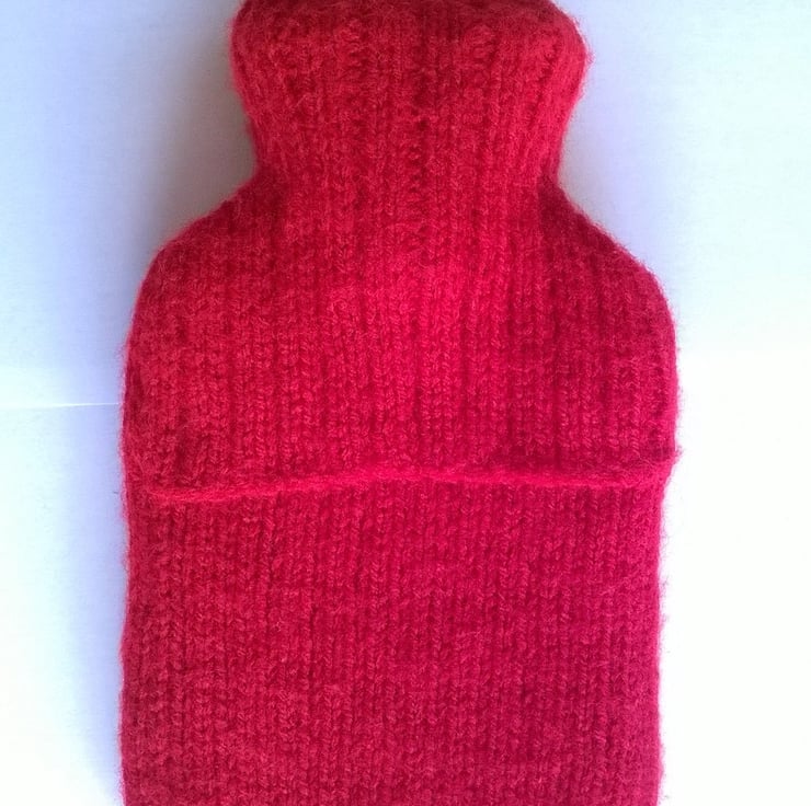 I have designed the top with a turn down cuff, encasing the whole of the plug, so little fingers will be deterred from 'fiddling', however it can be turned up for easy access to remove the plug for filling. The back is knitted in a rib stitch, with an envelope style opening to remove the bottle if required.