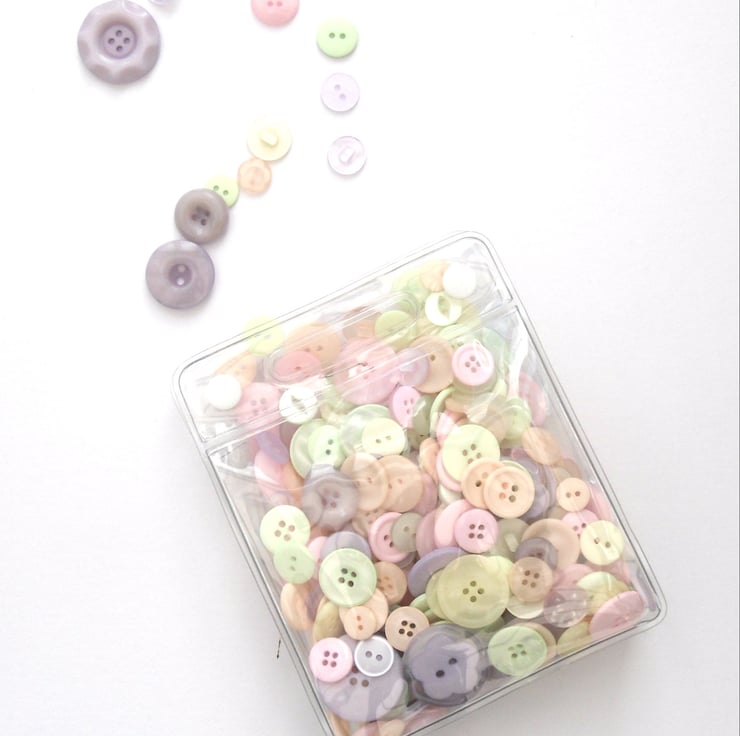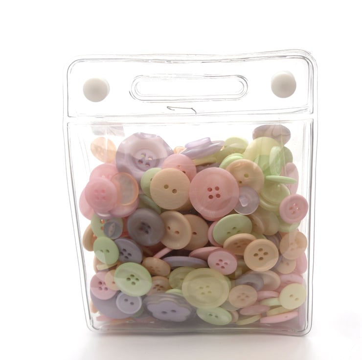 Bag rammed packed full of pastel coloured buttons. Beautiful high quality buttons , all sort of sizes. Bag is 5" x 5" and 1.5" deep and its full of buttons , in the hundreds !