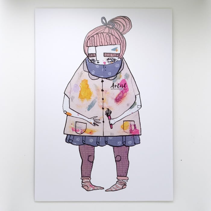 This girlie is a cute little Artist. She wears a light grey smock that is covered in lovely paint! This girl has been digitally cut out and placed on a crisp white background for printing purposes.