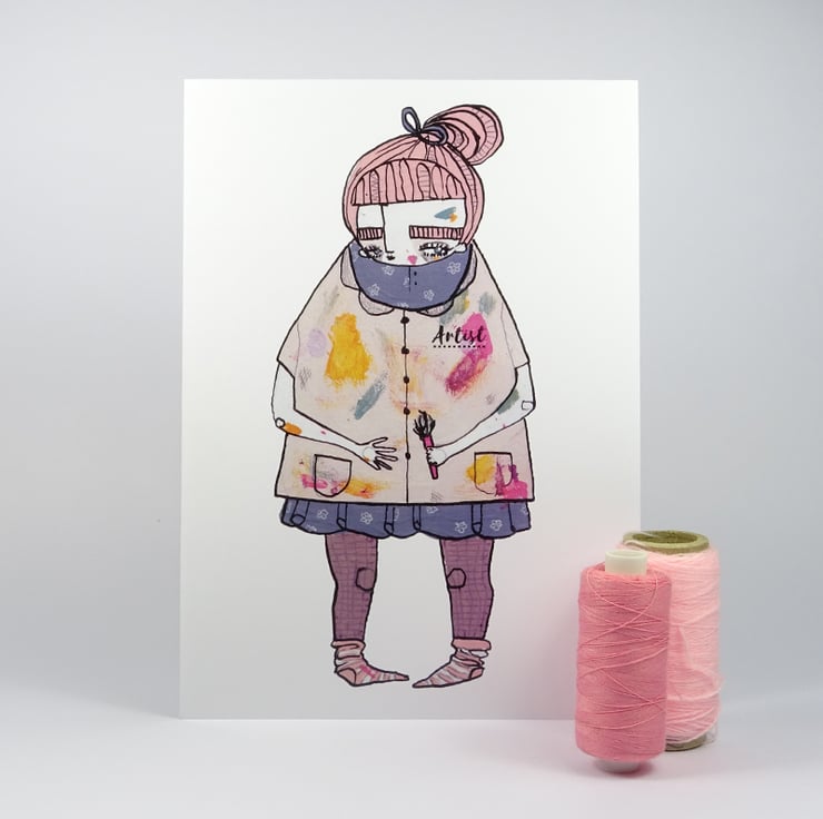 This girlie is a cute little Artist. She wears a light grey smock that is covered in lovely paint! This girl has been digitally cut out and placed on a crisp white background for printing purposes.