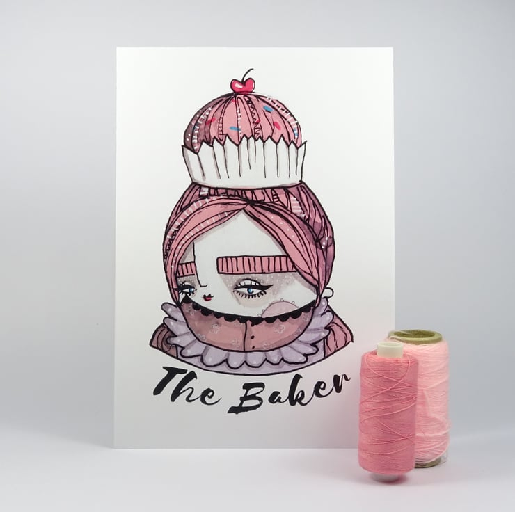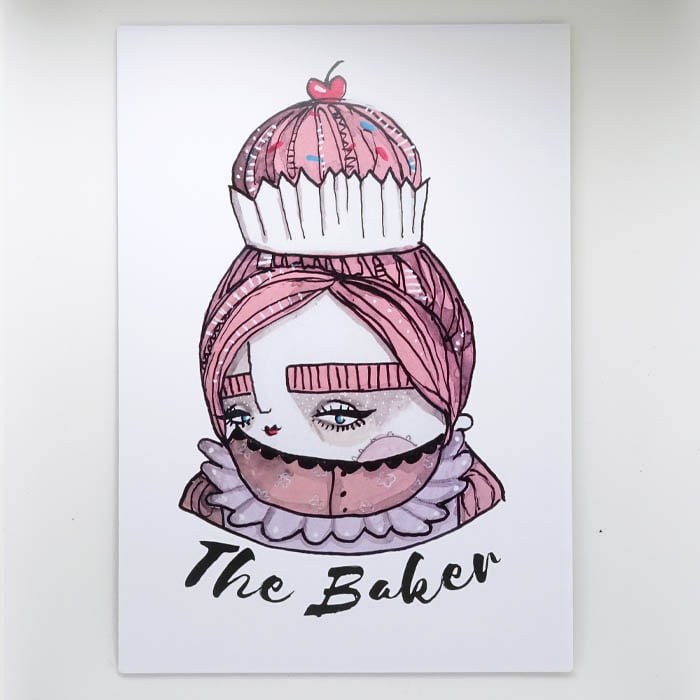 This girl is a baker. She loves cake, and has fashioned her hair into a lovely pink cupcake. This girl has been digitally cut out and placed on a crisp white background for printing purposes.