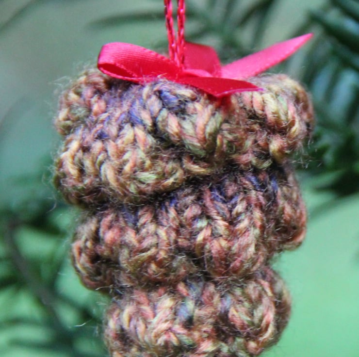 Knitted in gorgeous chunky variegated yarn to echo the different shades of a real cone, they measure 5cm long and are about 4.5cm diameter at the widest part.