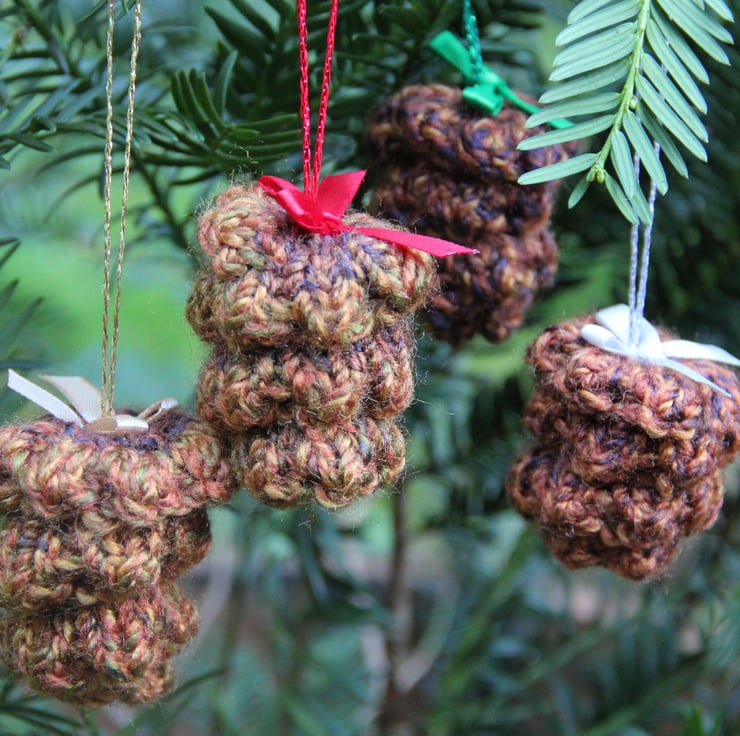 Four hand knitted Fircones with festive ribbon trim and matching hanging loop. One each of red, green, gold and silver.