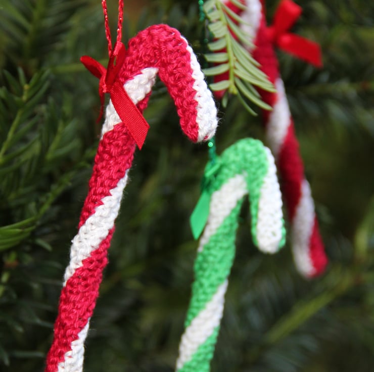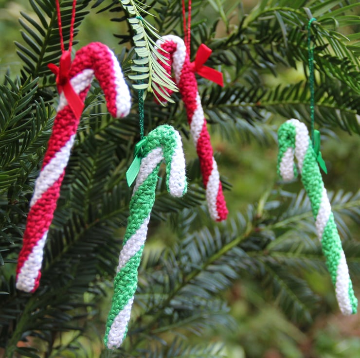 Knitted in beautiful silky cotton yarn, the canes measure 11cm long. They are stiffened using a plastic straw, so have no sharp bits.