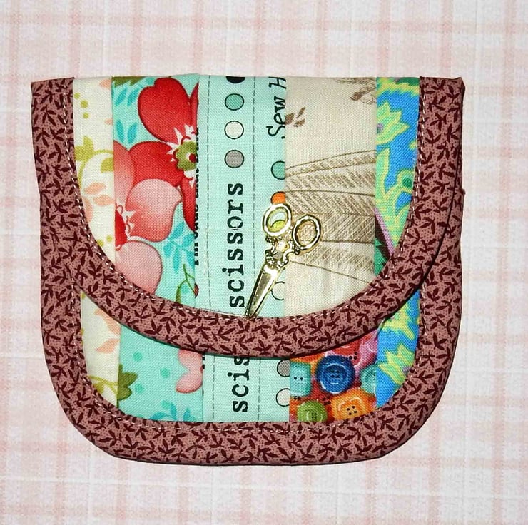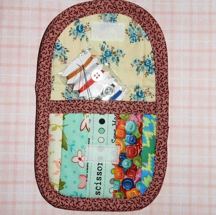This mini wallet measures approximately 4.5 x4.5 inches (when closed).It is made from pretty fabric strips, and trimmed with patterned bias binding. It has a pretty floral lining and fastens with Velcro with a decorative scissors embellishment. It also has a layer of cotton wadding. It is an ideal mini sewing case, it comes complete with the sewing set shown in the photo. It would also make a great wallet for your special teabags or pop in some plasters or painkillers for an emergency.